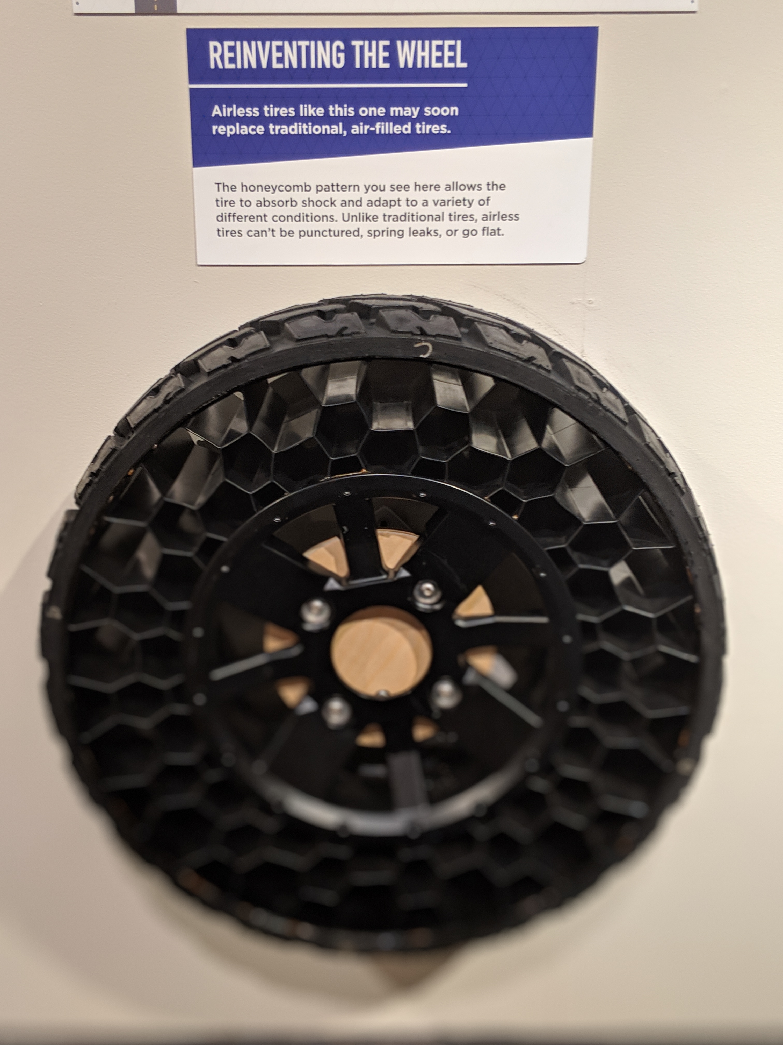 The area that I personally enjoyed the most was The Future of Car Tech section. This area had an example of airless tires and the LiDar sensor that is used to help self-driving cars navigate.