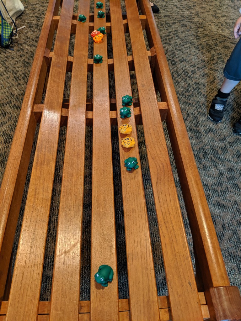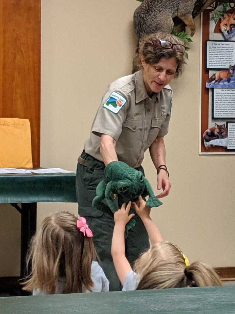 During the story times, children listen to stories associated with a nature theme, make a craft, play games and (weather permitting) take a hike outside along the paths in the park with a guide. The last one we participated in was all about frogs and it was held at Penitentiary Glen Reservation. The educator that ran the program was absolutely wonderful with the children. She taught them about the lifecycle of a frog, they made crafts, sang ‘5 little speckled frogs’, went on a nature hike outside, went on a scavenger hunt to find their own (fake) frogs, and many other activities.