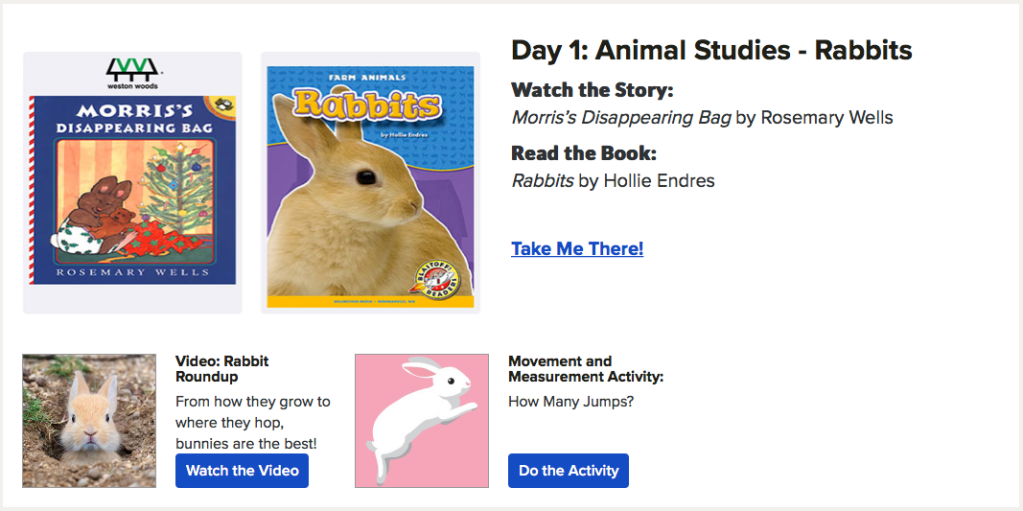 Today, we utilized Scholastics. I have a 2 and 5 year old, so we did the section for preschool and pre-K entitled, “Day 1: Animal Studies – Rabbits“. It was FABULOUS! The video was excellent and engaging for both of my kids.