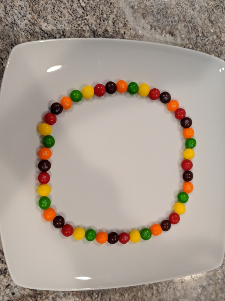 1. Lay out your skittles into pattern of your choice on a plate. (We placed our first set into a circle.)