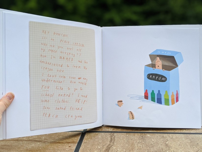 - It really brings out a child’s imagination! Whenever my children find a crayon without it’s wrapping, they immediately think about the letter from poor ‘Peach Crayon’ and laugh hysterically about his letter explaining how upset he was about his missing wrapping (image below from that page).