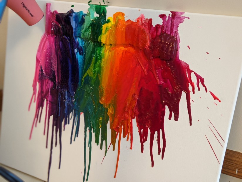 - Turn on your hair dryer and direct the heat onto the crayons evenly. The crayons will begin to melt and the color will drip and flow downwards onto the canvas. Your melted crayon art will begin to show! (Caution: The hair dryer will get hot!)