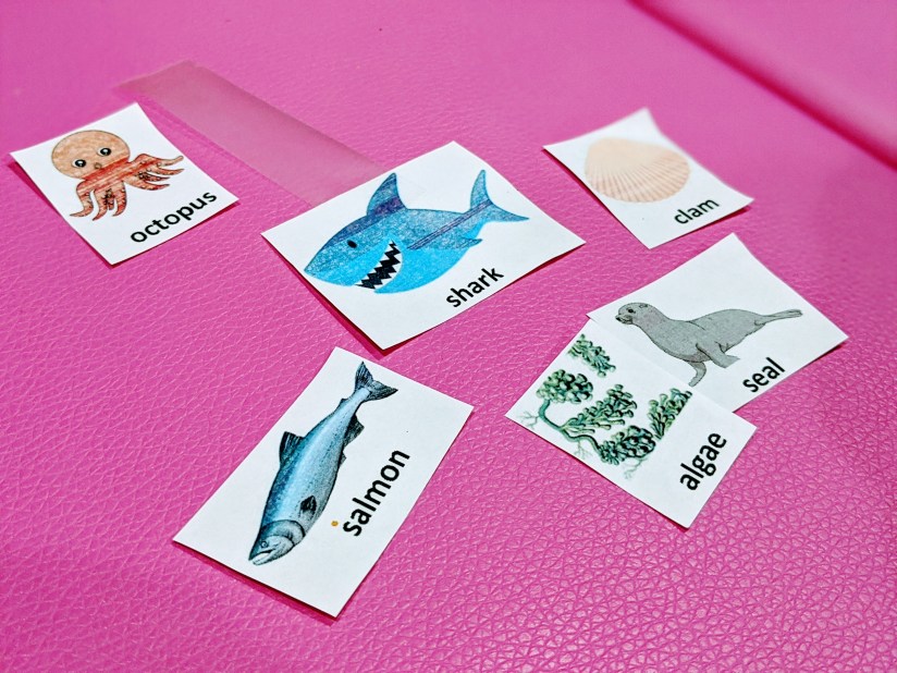 - Photos / drawings of the food chain predators and prey & tape OR use blue painters tape to write the names on them.