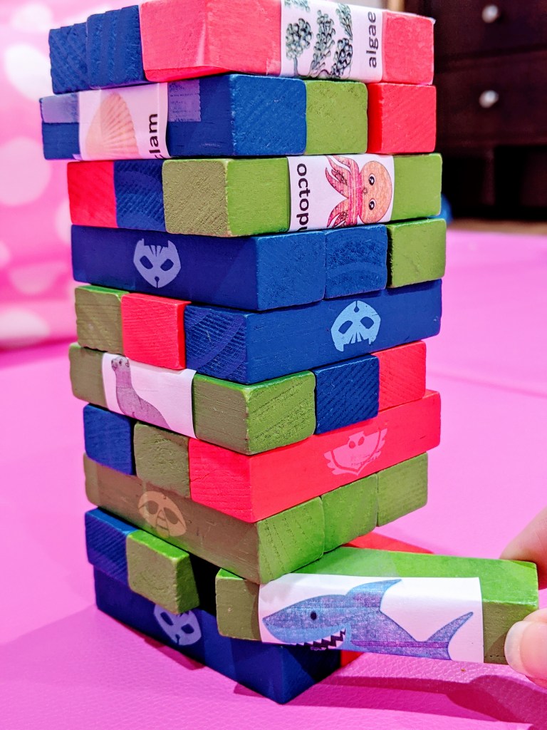 We chose to stack the apex predator, a shark, on the bottom of our tower with the prey near the top, however they could also be stacked in the opposite direction as well. No matter which way you stack them, talk to your children about how important the bottom blocks are to the rest of the structure. Everything is very closely interdependent on one another so the stacking of the blocks is not as important.