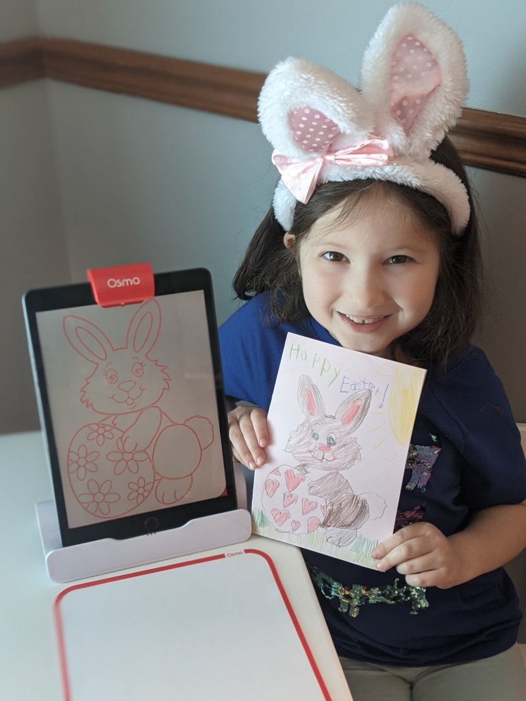 We downloaded the Osmo Masterpiece Drawing Game and let our kids go wild making some fun Easter cards! The Masterpiece game is another application for your little artist to practice drawing! Children can take a photo of their favorite object (like an Easter Bunny or a flower arrangement) and the iPad transposes it as a drawing on the iPad screen. Then children can draw the objects! There are templates available of various objects that children can select, like letters, cursive, and numbers. Once the drawing is complete, they are also saved into an ‘art gallery’.